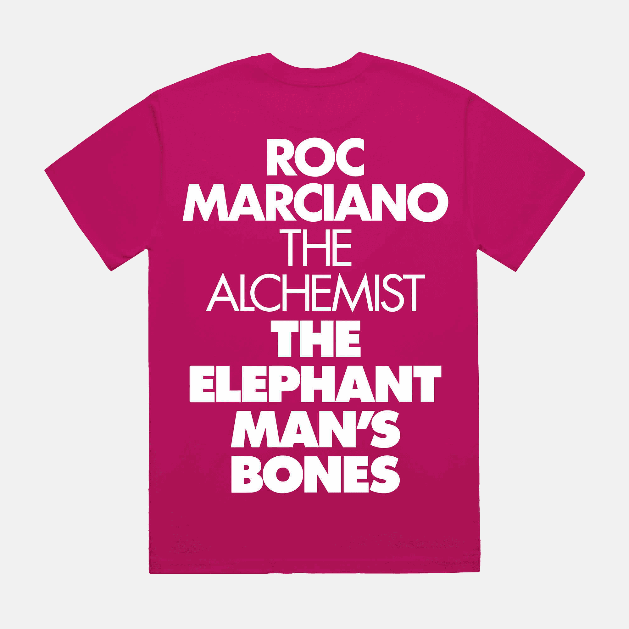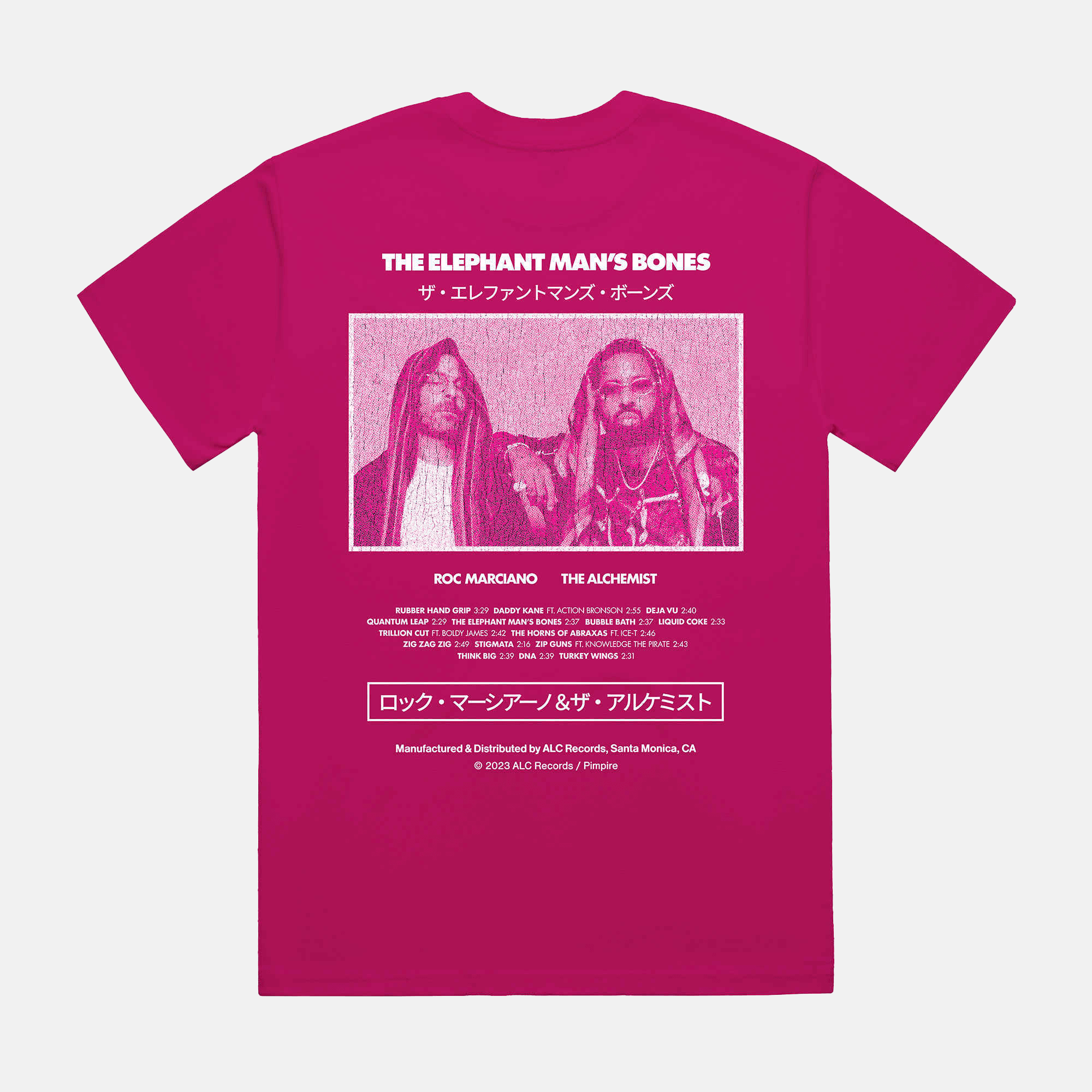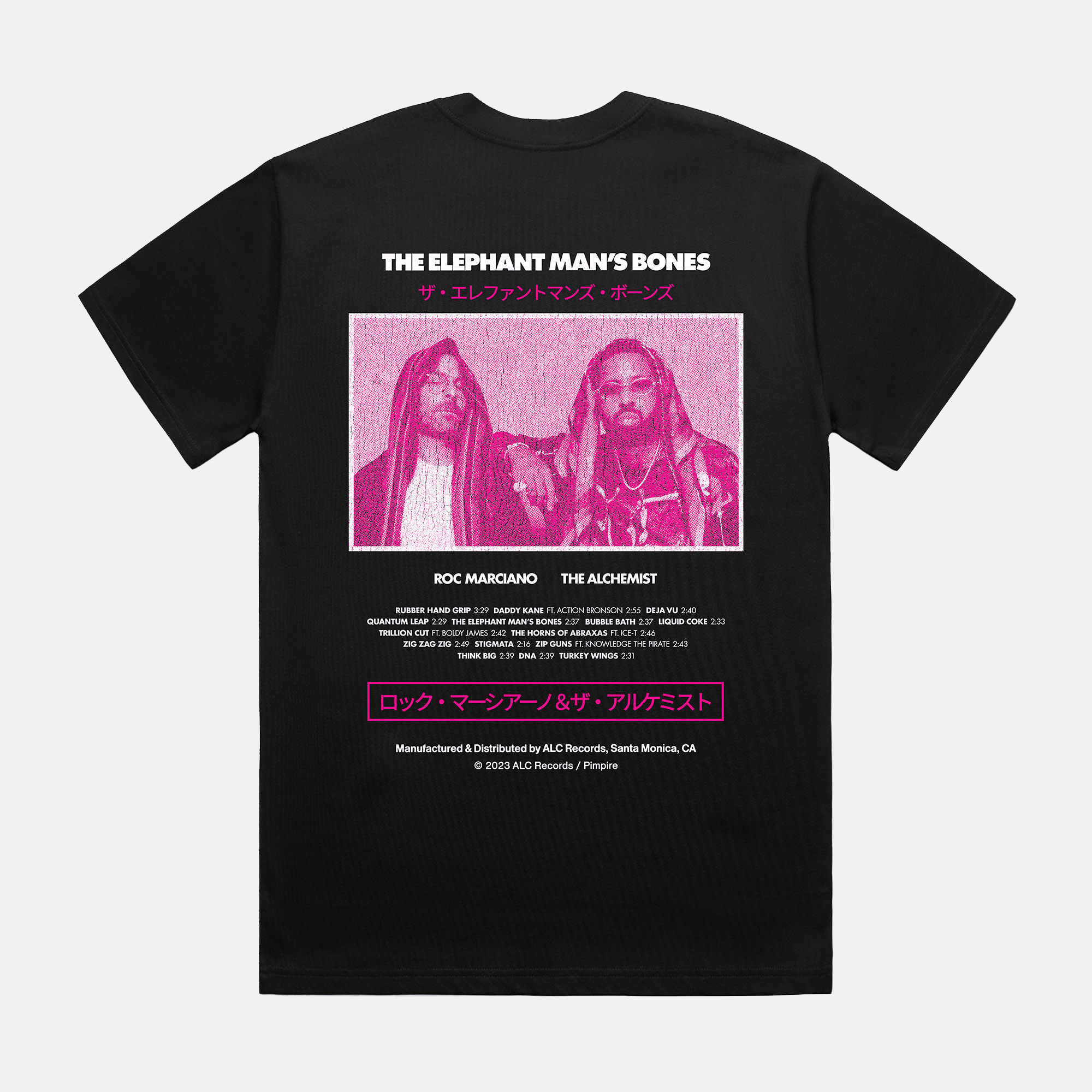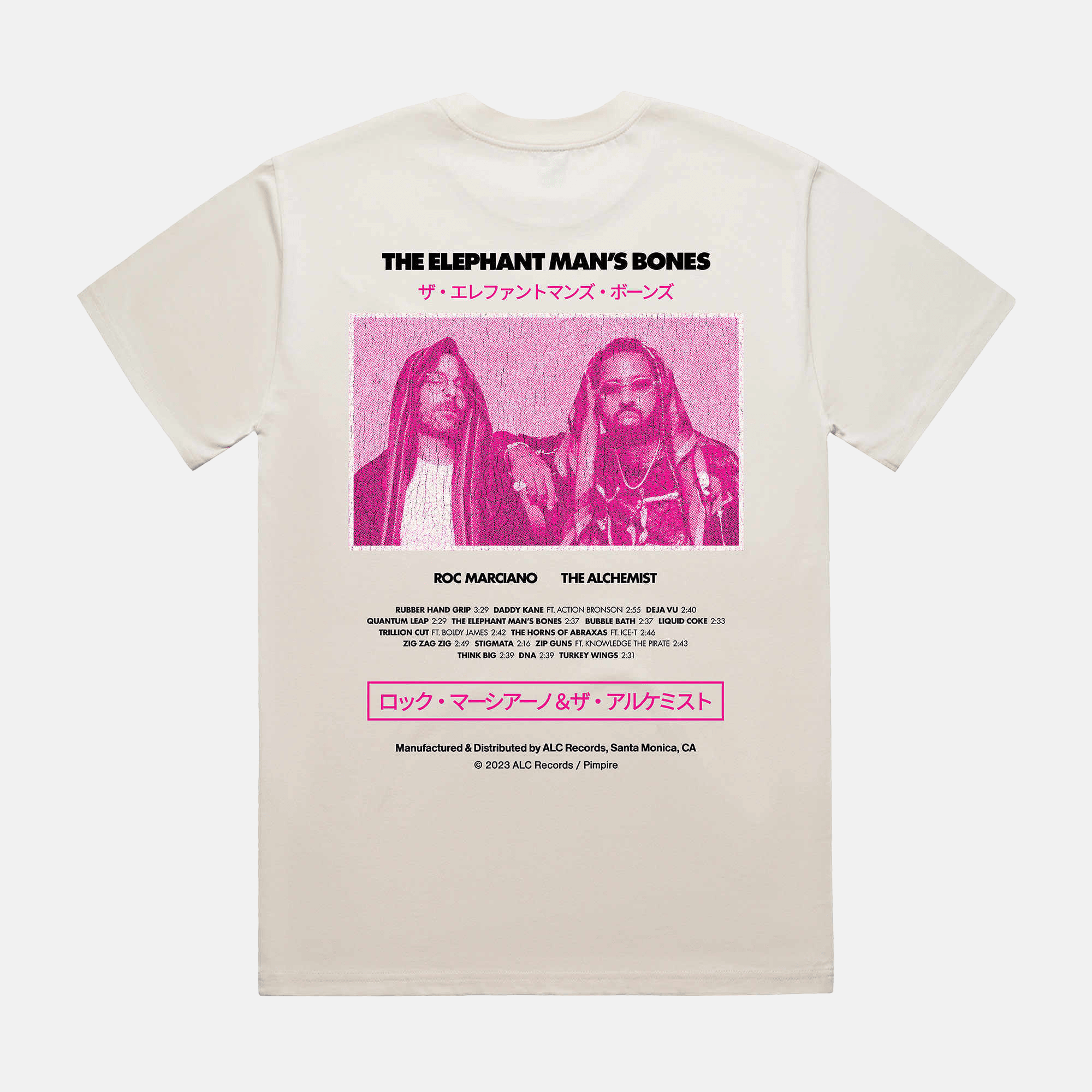 Designing the merch for the re-release of The Elephant Man's Bones by The Alchemist and Roc Marciano was an exciting opportunity to revisit the project with a fresh perspective. For this second merch drop, I took a completely different approach from the first, opting for a minimalistic design that directly referenced the album cover. The capsule featured monochromatic tones to highlight the raw, gritty nature of the album, while aggressive pink hues added a bold contrast, injecting energy and intrigue into the designs.