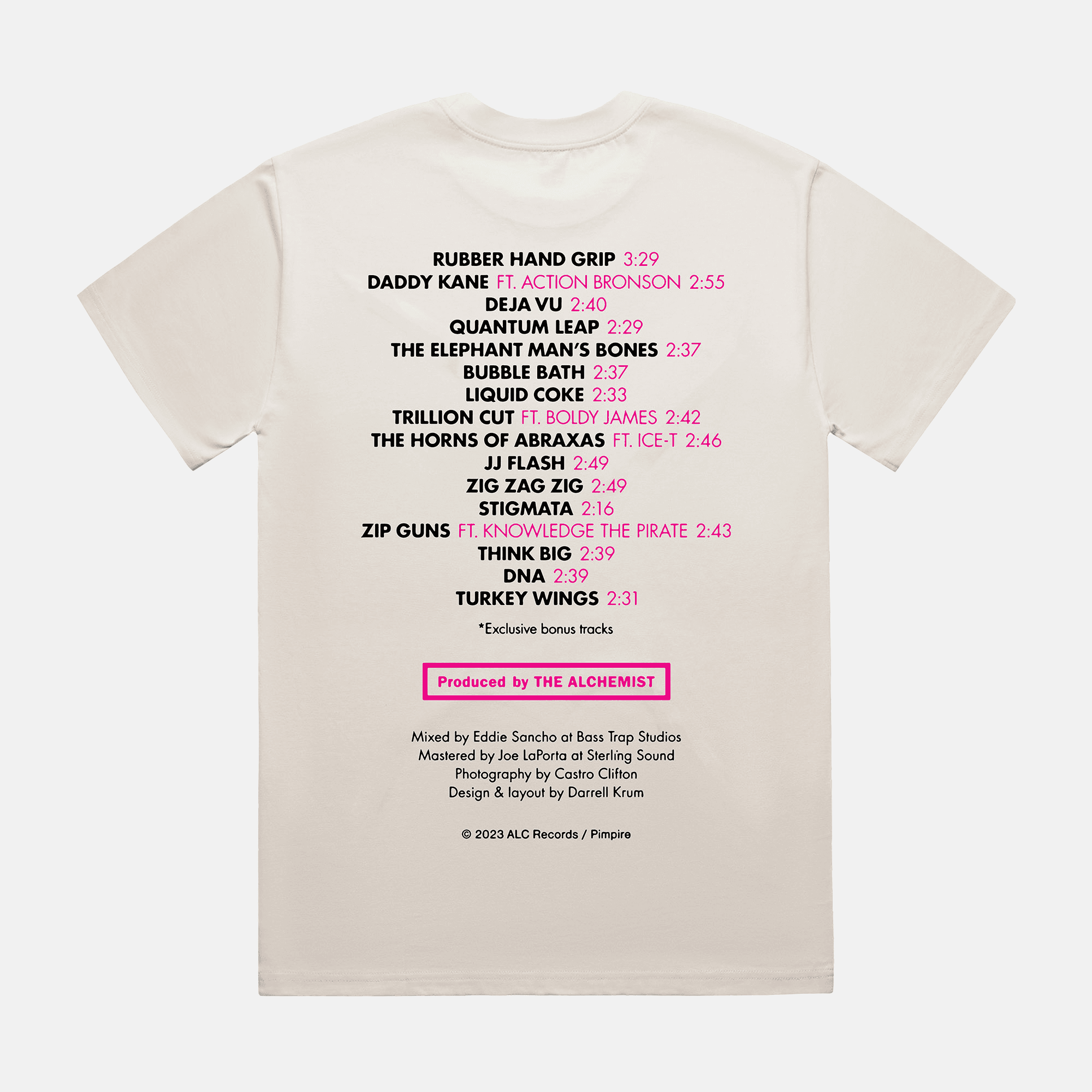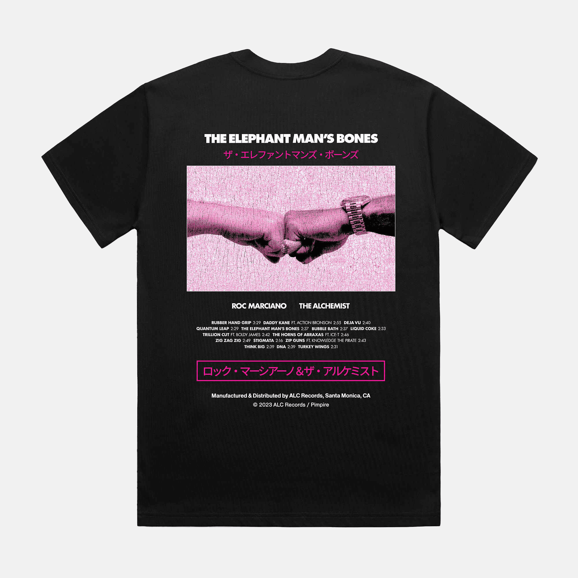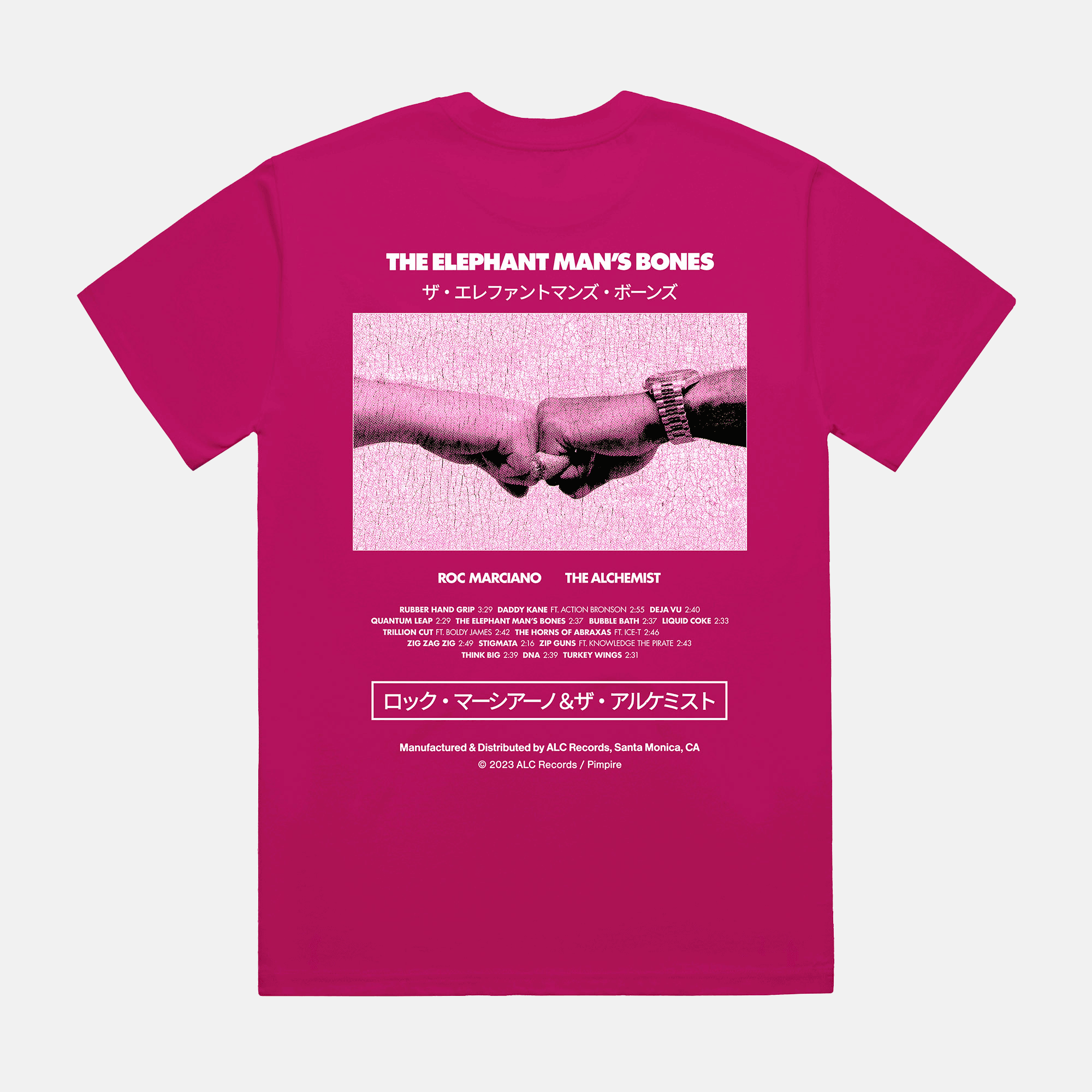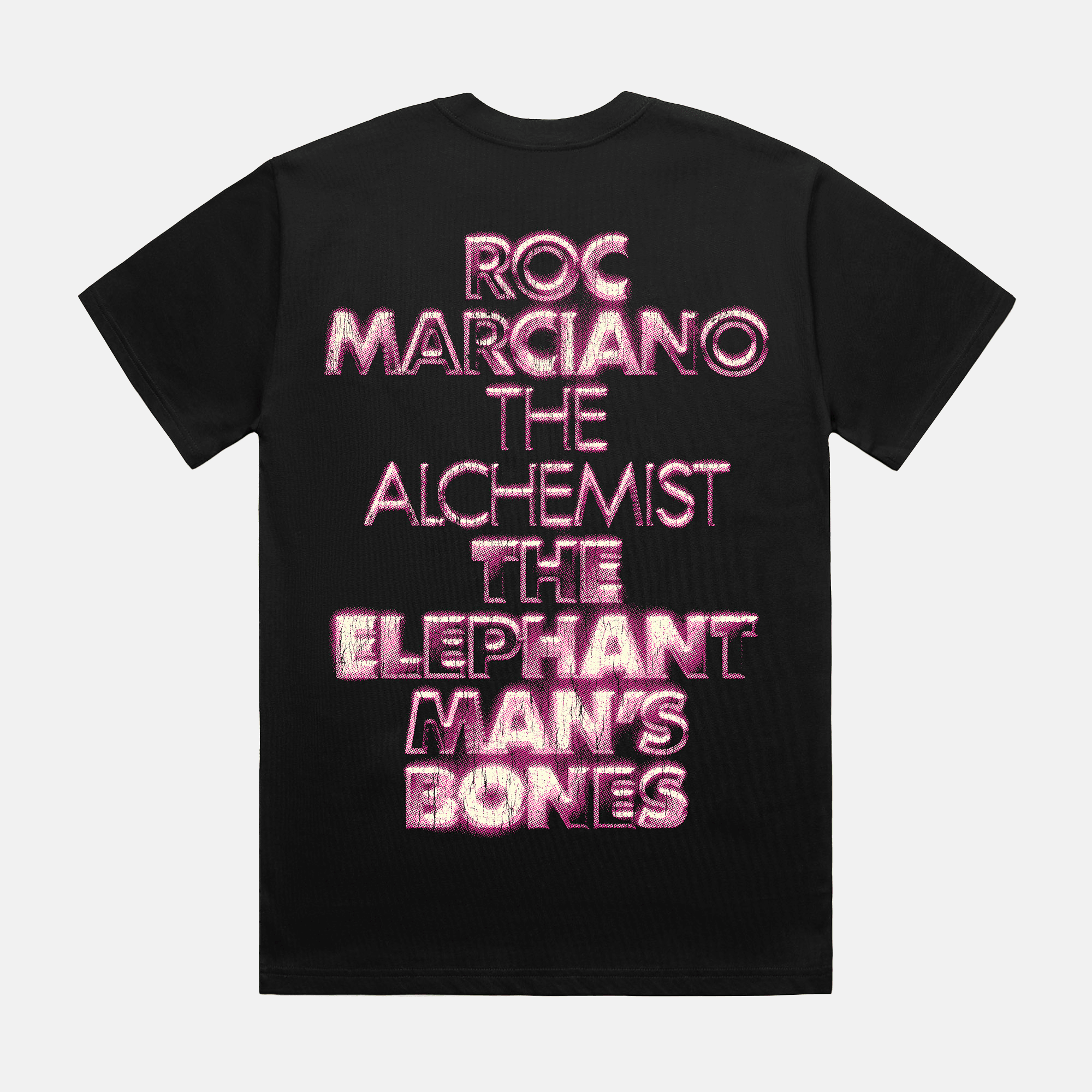 Designing the merch for the re-release of The Elephant Man's Bones by The Alchemist and Roc Marciano was an exciting opportunity to revisit the project with a fresh perspective. For this second merch drop, I took a completely different approach from the first, opting for a minimalistic design that directly referenced the album cover. The capsule featured monochromatic tones to highlight the raw, gritty nature of the album, while aggressive pink hues added a bold contrast, injecting energy and intrigue into the designs.