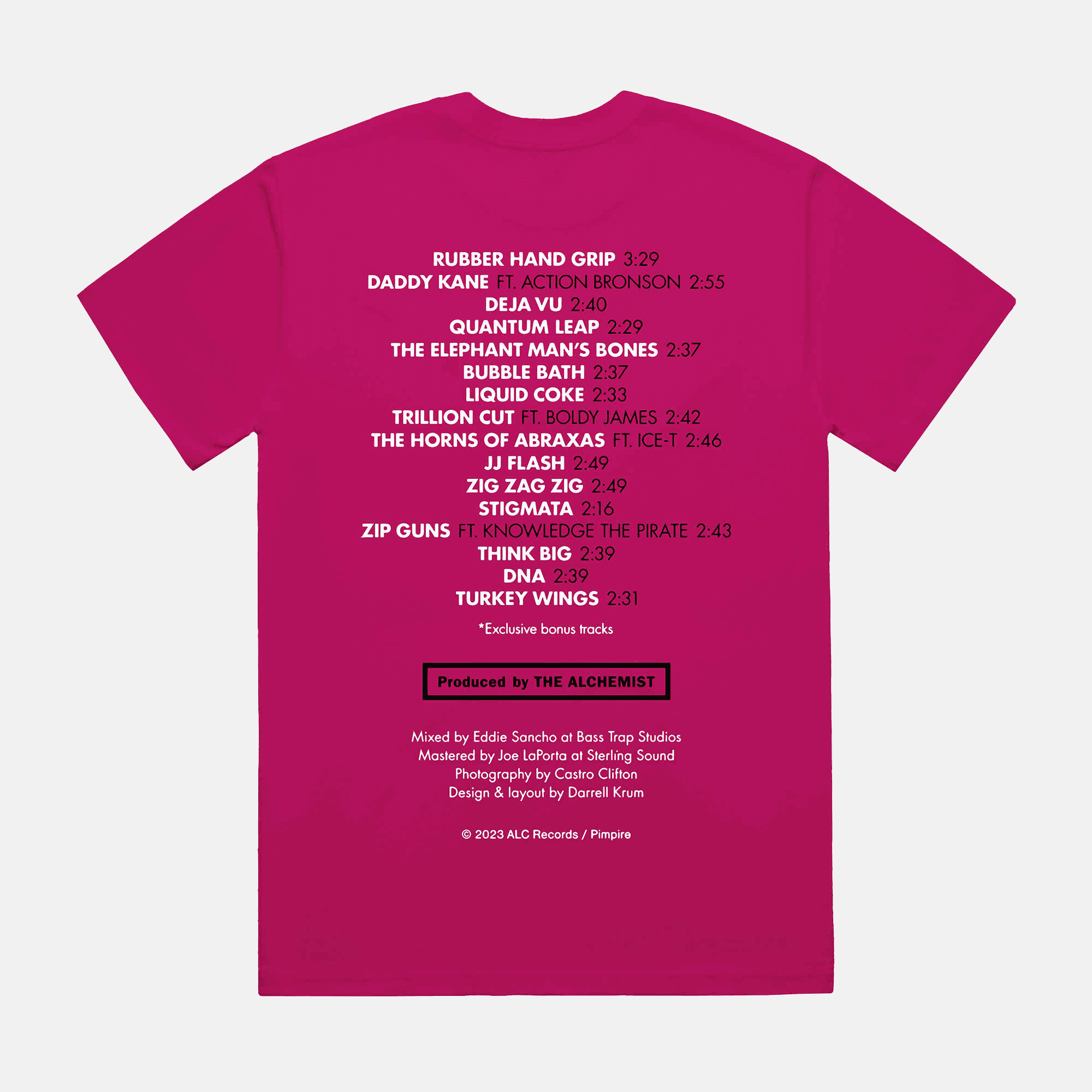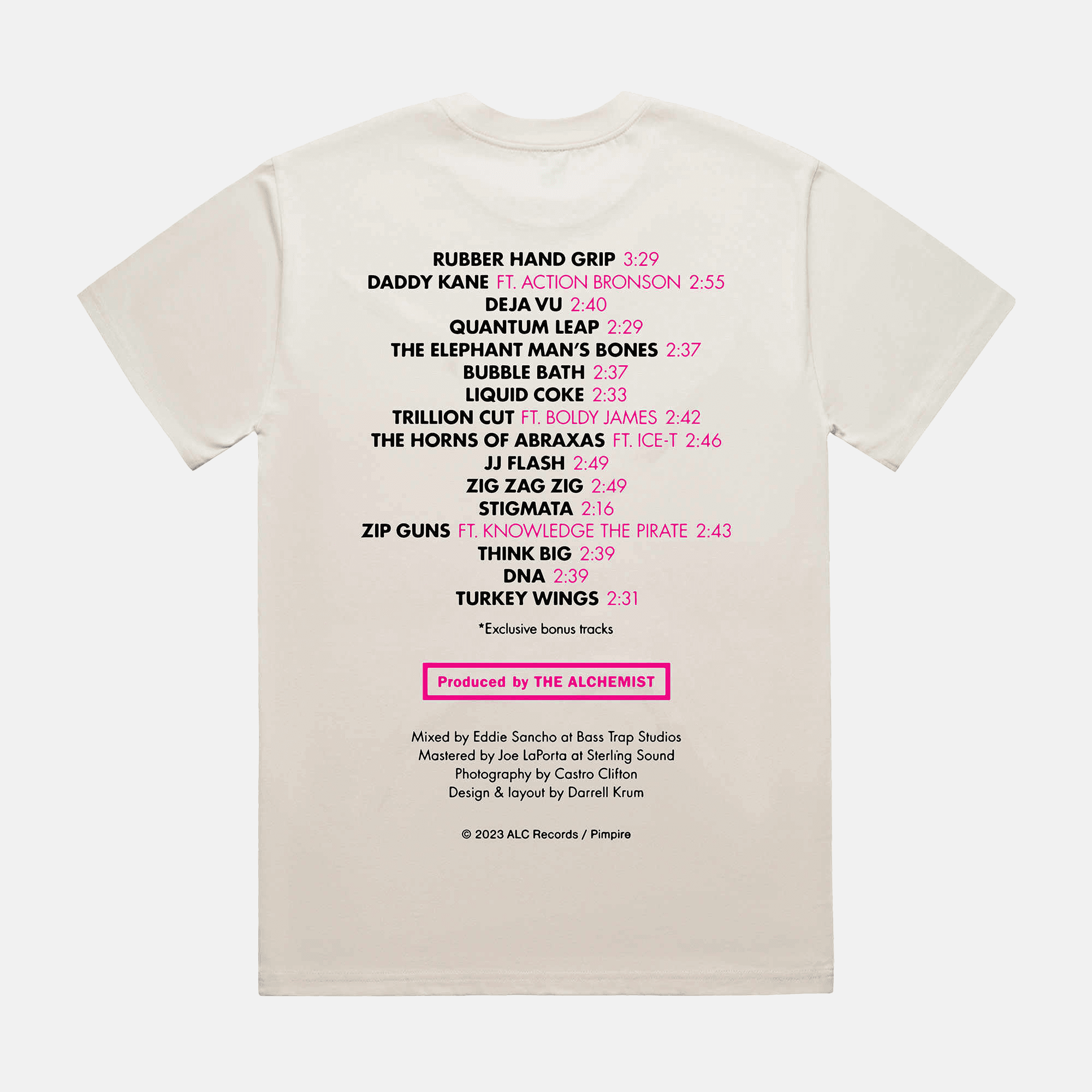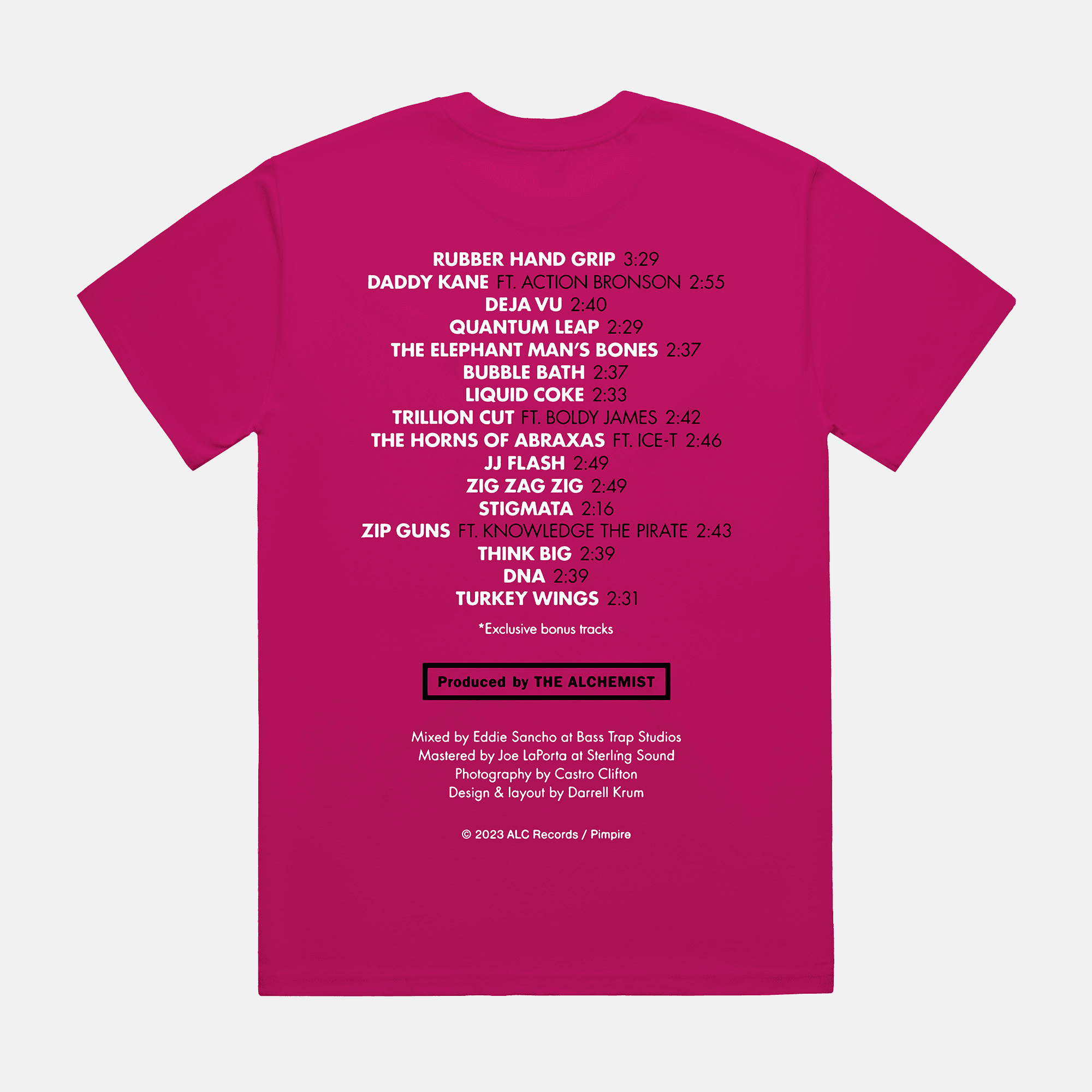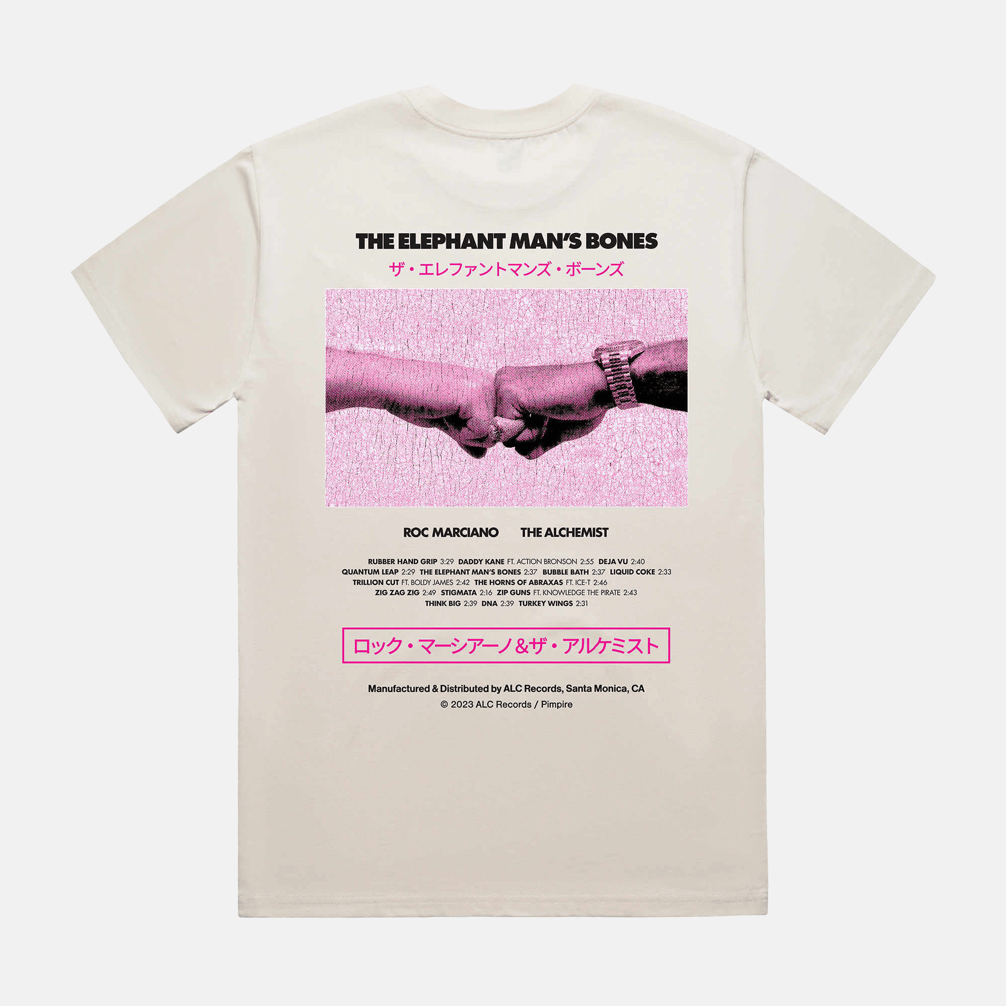 Designing the merch for the re-release of The Elephant Man's Bones by The Alchemist and Roc Marciano was an exciting opportunity to revisit the project with a fresh perspective. For this second merch drop, I took a completely different approach from the first, opting for a minimalistic design that directly referenced the album cover. The capsule featured monochromatic tones to highlight the raw, gritty nature of the album, while aggressive pink hues added a bold contrast, injecting energy and intrigue into the designs.